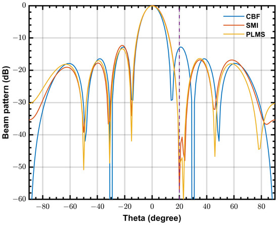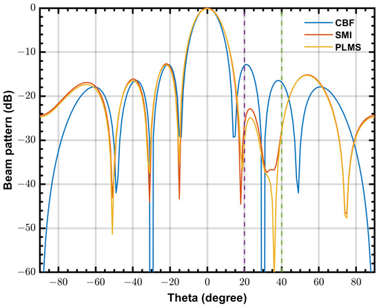 The CBF and diagonal loading SMI beamformers are also simulated for comparison, where , and