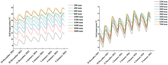 In order to elucidate the modification of soil temperature at varying depths in distinct span positions, the circumstances under sunny and weak light weather conditions were selected for analysis. The soil temperatures at varying depths in distinct span positions on the dates 12 December 2023 (weak light) and 23 December 2023 (sunny) were analysed, as illustrated in Figure 12.