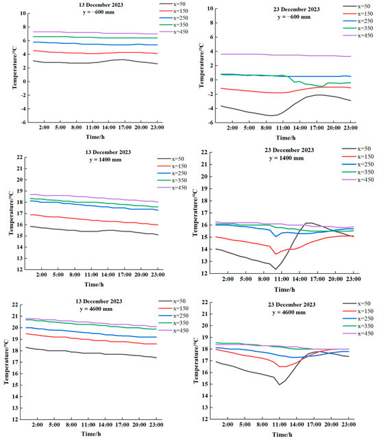 From Figure 12, it can be seen that in spite of the weather conditions, the indoor and outdoor soil temperatures increased gradually with depth, with the greatest increase occurring at a depth of x. The outdoor temperature (y = −600 mm) exhibited a high degree of variability; a comparison of the temperature change of soil measurement points at x = 350 mm and x = 450 mm with the same span indicated a gradual decrease in the trend, with the exception of a maximum difference of 1 °C at y = 8400 mm. Furthermore, the temperature of these two points at other span positions in the room is less than 0.5 °C. With the exception of the maximum difference of 1 °C at y = 8400 mm, the temperature at these two points is less than 0.5 °C at all other span positions in the solar greenhouse. At the same depth, the soil temperature gradually increased as the y value increased, which indicated that the measuring point was situated in close proximity to the north wall. It has been observed that temperature changes in shallow soils exhibit significant fluctuations during periods of peak light intensity. In contrast, deeper soils, particularly those found in greenhouses, were not affected by light intensity and exhibit flatter temperature changes.