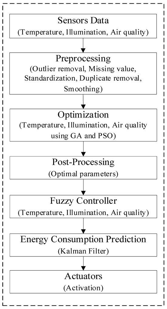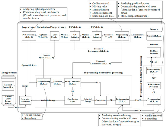 Figure 1, we show the proposed improved energy-efficient system model for energy conservation and proficiency in green building environments. Primarily, the real input parameters are handed over to the smoothing segment for preprocessing. Afterward, the smoothed parameters and user-set parameters are passed to the PSO-based optimization part of the system model to develop the optimal parameters (OP). The enhanced Ops are once more passed to the GA segment to further improve the OP. The enhanced OPs are utilized as the OCI to assess the green buildings’ indoor environment. The reason behind optimizing the parameters twice is to obtain a much better comfort index with minimum energy consumption. Then, the post-processing is carried out to disseminate, analyze, and share the outcomes with the consumers. At this point, the OPs are once more preprocessed before they can be progressed to the control component. The fundamental objective of smoothing and preprocessing at this level is to additionally work on the OP and OCI. The OCI is determined yet again by utilizing the refreshed OP. This further develops and improves the occupant’s OCI.