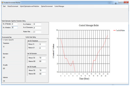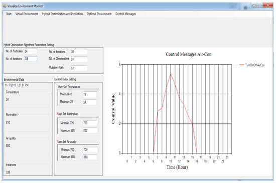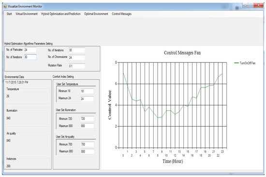 Every actuator has four levels: level 0, level 1, level 2, and level 3. Level 0 means turn off, level 1 means turn on at slow speed, level 2 means turn on actuator at medium speed, and level 3 means turn it on at high speed. Every emulator made the MI change its present status inside the residential building. At the point when these actuator emulators acquire the MI, the relevant state is altered to refresh the internal environmental conditions. The control signals characterized in