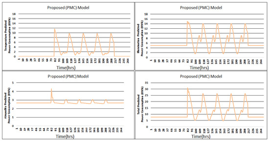 The second point where the proposed model shows its significance is energy consumption. The proposed PMC framework consumed less power in the case of temperature consumption. Additionally, in the case of illumination, the proposed PMC framework devoured less power. Similarly, regarding power utilization in the event of air quality, the proposed PMC framework devoured less power. The total power devoured by the proposed PMC framework is substantially less. This is a significant achievement of the proposed PMC model in terms of power consumption compared to the state-of-the-art frameworks.