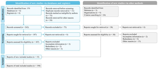 Of the 370 articles initially screened from various databases, 108 were excluded by screening the titles and abstracts. In addition, 75 articles were excluded by full-text analysis due to research quality, incomplete information, journal reputation, redundancy, etc. In addition, 19 additional reports were added when we reviewed the references of the selected articles, websites of public datasets, and relevant organizations. In the end, 198 reports were used to develop this review based on the selection criteria. Figure 1 shows the PRISMA implementation process.