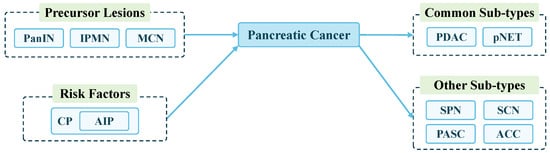 The pancreas consists of the head, neck, body and tail of the pancreas, located in the abdominal cavity. PC is usually referred to as a tumor that arises within the epithelial cells of the pancreas []. Smoking, obesity, diabetes mellitus, alcohol, pancreatitis, allergies, the microbiome, the environment, occupation, family history of cancer, and CP are risk factors of PCs [,]. Autoimmune pancreatitis (AIP) is a rare form of CP []. Pancreatic intraepithelial neoplasms (PanINs), intraductal papillary mucinous neoplasms (IPMNs), and mucinous cystic neoplasms (MCNs) are precursor lesions of PC [].