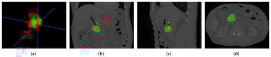 As shown in Figure 3, ITK-SNAP [] was used to visualize CT images, where the red labels represent healthy pancreatic tissues and the green parts represent PC tissues. The task of this dataset is to subdivide the pancreas and the PC, the latter being relatively challenging.