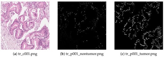 PAIP sample data: (a) a pathological image of PC, (b) nontumor cell nucleus mask, (c) tumor cell nucleus mask (The masks were processed to be visible).