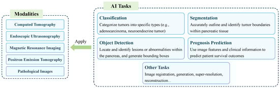 This paper is a comprehensive review of the application of various AI models to medical images in five modalities of pancreatic images. Sub-types of pancreatic cancer, evaluation metrics for different tasks, and mainstream AI models are discussed. The main contributions are as follows: