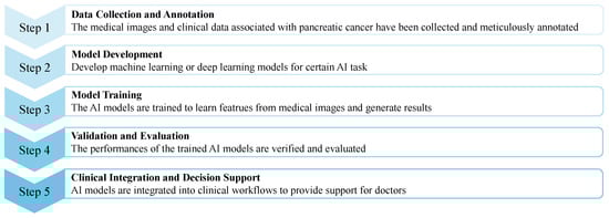 The workflow of AI-enabled automated PC analysis is shown in Figure 7. The medical images and clinical data (if available) are first collected and annotated; then, the data will be pre-processed as the input of AI models for a certain task. Next, the AI models are trained to learn the features and generate corresponding results. Finally, AI models can be applied to support clinical workflows after they have been assessed as reliable.