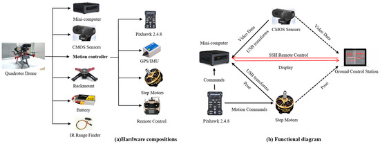 To complete the inspection of pavement cracks on mountainous roads, a UAV must be equipped with a variety of sensors to ensure flight stability and to perform necessary tasks. The overall hardware architecture of our UAV inspection system is illustrated in Figure 2. The system consists of a mini-computer, two CMOS sensors, a motion control system, an Infrared Range Finder, and a rack mount. The UAV platform is supported by a folding carbon fiber rack with a Pixhawk autopilot. The motion controller, which includes a Pixhawk (v2.4.8), four step motors, a GPS/IMU unit, and a remote control, is responsible for guiding the UAV during autonomous flight. An IR Range Finder is utilized to measure the distances from the ground and to detect obstacles like trees or power lines. All sensors and controllers are connected to the mini-computer, which handles tasks such as processing pose data from the GPS/IMU, RGB video data from the mono-camera, and encoder data from the step motors. The processed results can be transmitted to a Wi-Fi-connected laptop for display and further analysis. The entire system is powered by a 14.8 V lithium battery. The key hardware components of the UAV inspection system are detailed in Table 1.
