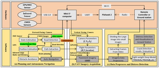 In recent years, Unmanned Aerial Vehicles (UAVs) that carry a variety of micro-sensors have been widely applied in various inspection missions [5,6] due to their compact size, affordability, flexibility, and mobility. For instance, in the inspection of power transmissions, using an UAV inspection system instead of manual inspection can greatly reduce the risk of daily inspections [7]; meanwhile, UAVs have also gained increasing popularity in road detection and monitoring, which can greatly reduce the inspection time and extend to unknown complex environments. Liu et al. [8] proposed a systematic solution for automatic crack detection via UAV inspection with both hardware and software equipment, but the UAV lacked autonomous navigation and detection ability. In addition, UAVs are also gaining significance in the field of structural health performance inspections for civil engineering infrastructure, such as pipeline inspection [6,9] or bridge inspection [10]. Nevertheless, most existing UAV-based inspection systems [8,11,12] primarily focus on data acquisition, transmission, and some degree of pre-processing to achieve high-quality imagery. Moreover, inspectors still rely only on the visual inspection of images or partial computer vision methods to identify cracks [13]. However, the complexities of mountainous terrain and uneven roads pose challenges in manipulating flight routes and maintaining consistent vertical altitudes, thus making it difficult to obtain high-quality imagery. Additionally, the limited load capacity, computing ability, and endurance of small UAVs make it challenging to carry multiple sensors and to fly for extended periods [6]. For these reasons, existing commercial UAVs cannot be directly applied for this mission. Therefore, there is a need to design a high-performance, multi-functional, and reliable UAV inspection system with autonomous capabilities that is specifically tailored for mountainous roads and detecting defects such as pavement cracks.