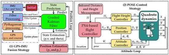 In order to ensure the autonomous navigation and flight operations of UAVs along mountain roads and terrains, it is crucial to maintain autonomous flight and a constant altitude for the UAVs. This can be accomplished through two primary strategies (which are depicted in Figure 4): (1) the GPS/IMU fusion strategy for autonomous flight, and (2) the POSE Control Strategy to ensure the drone’s attitude and altitude. Initially, we utilized GPS/IMU for the Pixhawk 2 position estimation and TSDF’s 6 DOF for pose estimation as the input. A fusion strategy known as the graded Kalman filter [26] was then used to integrate the IMU and GPS positioning information in order to estimate the current position and state of the UAV. Additionally, a cascade control loop was employed for control, addressing both the inner loop control (attitude loop) and the outer loop control (position loop). Among the control methods investigated, the composite nonlinear feedback (CNF) method for attitude stabilization and the robust perfect tracking (RPT) method [27] for trajectory tracking have demonstrated superior performances. The flight control laws were implemented using a PX4-based flight controller in this study.