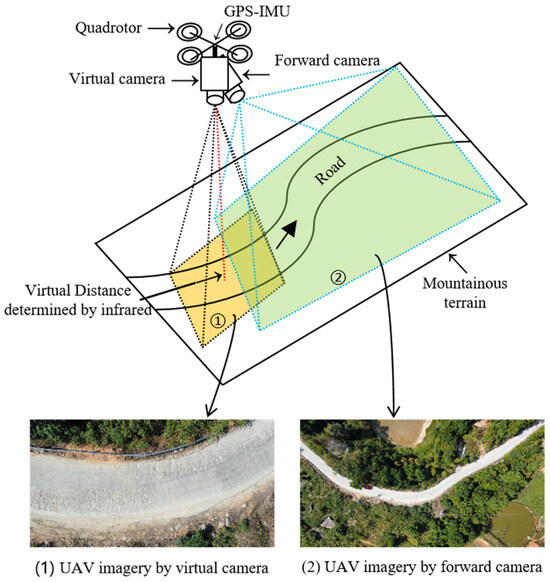 The acquisition of data imagery in our UAV inspection system was divided into two parts: local data imagery for road pavements and global data imagery for mountainous terrains. Figure 6 illustrates the diagram of the UAV data acquisition process. The forward camera is mainly used to capture the global mountainous terrain, thus assisting the drone in tracking ground road feature points and landmarks for autonomous positioning and navigation. It is a compact camera that provides a comprehensive view of the scene. On the other hand, the vertical camera is a high-definition camera that focuses on the local field of view scene and is primarily used for identifying and detecting road crack targets. Additionally, to determine the optimal altitude of the UAV and ensure efficient flight, the following considerations should be taken into account: (i) the UAV camera view should cover the full width of the road that needs to be inspected; (ii) it is important to avoid any interference from auxiliary facilities such as roads, trees, and street lights during the flight; and (iii) it is crucial to maintain a constant vertical distance from pavements, maintain a consistent speed, and capture vertical imagery to minimize image distortion.