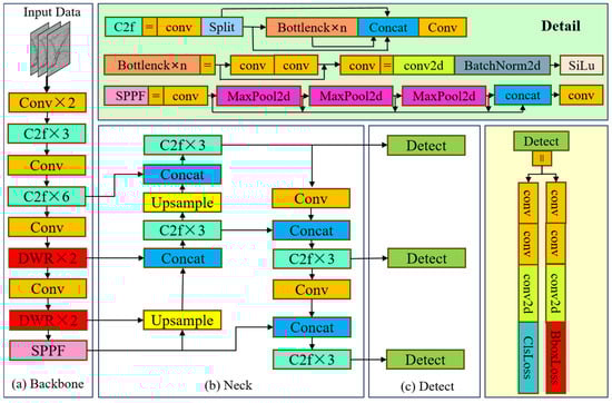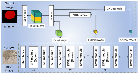 In the MRC-YOLOv8 model, some original C2f modules in the original YOLOv8 were replaced with DWR modules to simplify the model and reduce parameter count. The DWRSeg network incorporates an attention mechanism, utilizing a novel Dilation-Wise Residual (DWR) module and a Simple Inverted Residual (SIR) module at both high and low levels. The network architecture, illustrated in Figure 8, is known for its simplicity and efficiency. The attention mechanism in the DWRSeg network enhances important image information by prioritizing specific areas, thus facilitating information fusion and interaction across different levels or scales. This selective amplification of feature channels containing target information enhances the model’s performance. The network structure comprises a DWR module and an SIR module for high- and low-level features. The encoder–decoder configuration includes four stages: the stem block, the low stage of SIR modules, and the two high stages of DWR modules. The DWR module captures multiscale contextual information and efficiently fuses feature maps, while the SIR module is tailored for smaller receptive field sizes in the lower stage to enhance feature extraction efficiency.