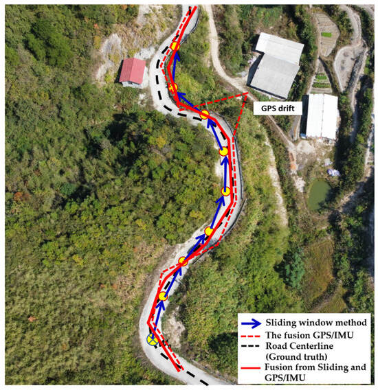 To evaluate the effectiveness of our proposed method, this study conducted a comparative analysis of the route generation using the customized UAV inspection system. The experimental scenario involved simulated data, which were analyzed with the graded Kalman filter [26]. Figure 11 illustrates a comparison of the route generation results, highlighting the potential of the proposed sliding window method to compensate for GPS/IMU positioning errors and to even replace GPS/IMU data, particularly in GPS-denied or GPS-drift mountainous roads during UAV flights. In this figure, the fusion GPS positions (represented by the red dotted line) obtained from the GPS/IMU sensor were plotted for each second of received information. The simulated positioning was also calculated using the proposed sliding window method, and the results were shown through the blue arrow line in Figure 11. A general comparison with the ground truth (represented by the black dotted line) revealed that both routes experienced some positioning errors, especially the GPS/IMU sensor that had a max. 4 m visible error GPS drift. Furthermore, a fusion method was employed to integrate the GPS/IMU data and the simulated data. The results demonstrate that the fusion route closely aligns with the road centerline, specifically the ground truth.