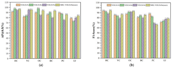 To demonstrate the algorithms’ effectiveness for various models, the following four commonly used evaluation metrics were used in this study to access the identification accuracy: Precision (P), Recall (R), F1-Score, Average Precision (AP), and Mean Average Precision (mAP). The results in Table 6 indicate that the MRC-YOLOv8 model also exhibited the highest accuracy compared to the other algorithms, thus surpassing the performance of the remaining YOLO models. Specifically, our improved YOLOv8 achieved values of 90.7% for Precision, 89.8% for Recall, 87.4% for F1-Score, and 92.3% for mAP. Notably, the latest iteration of YOLOv9n did not demonstrated optimal performance, exhibiting the lowest precision across the various metrics. It is evident that the current open-source version of YOLOv9 requires additional refinement.