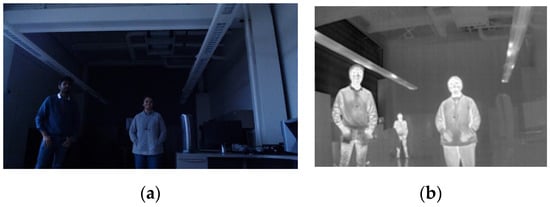 Infrared (IR) thermal imaging serves as an alternative solution to address nighttime perception challenges in AD and ADASs. By detecting heat radiation from objects and capturing variations in heat distributions among different object types, a thermal infrared camera effectively portrays objects with higher heat radiations in a brighter manner. Notably, the IR thermal sensor operates without visible lights. This makes it a reliable choice for nighttime and adverse weather conditions such as fog, rain, overcast, dust storms, and more []. Figure 1 displays images captured by both standard RGB and IR cameras under the low light condition at the same time. The initial image in Figure 1a represents an RGB image with a resolution of 960 by 540. Due to the low illumination conditions, the person at the back is not captured in the RGB camera image. On the other hand, the IR thermal image with a resolution of 640 by 512 in Figure 1b shows the person at the back clearly. This example shows thermal imaging remains unaffected by lighting conditions and provides consistent image output regardless of light availability.