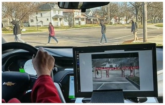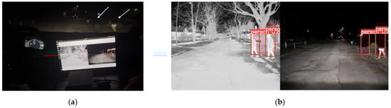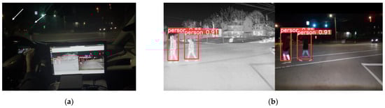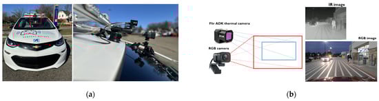 As presented in Figure 3a, this research utilizes a multi-sensor configuration integrated into a Chevrolet Bolt platform. The FLIR ADK IR thermal camera [] serves as a pivotal component, offering high-resolution thermal imaging capabilities at a 640 × 512 resolution with a 50° field of view (FOV) and a rapid capture rate of 60 fps. Complementing this, the Logitech (Logitech, San Jose, CA) Stream Cam [] is employed to record RGB video at a resolution of 960 × 540 with a 78° FOV, also at 60 fps. The IR thermal camera is mounted on the roof of the car and the RGB camera is located on the windshield of the car near to rear-view mirror. Figure 3b presents the captured images with different FOVs and resolutions. To enable real-time inferencing for object detection under low illumination conditions, the NVIDIA Jetson Orin [] computing device is utilized as an in-vehicle computing unit, leveraging its robust computational capabilities and 32 GB RAM. Table 1 summarizes the specifications of the in-vehicle computing unit, the NVIDIA Jetson Orin.