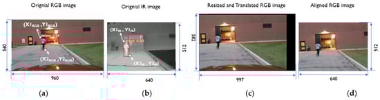 - Each RGB image is aligned using the proposed image alignment algorithm in Section 3.2. The aligned RGB has the same image width, imgW, and image height, imgH, as the corresponding IR thermal image.