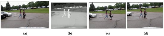Figure 5 displays the image alignment results produced by both the existing registration method and the proposed image alignment method. Figure 5a,b depict the original RGB camera image and its corresponding IR thermal image, respectively. In Figure 5c, the output from the current registration method is shown. A comparison with the corresponding IR thermal image reveals noticeable misalignment, particularly in areas such as trees, cars, and pedestrian locations. In contrast, Figure 5d presents the output from the proposed method, demonstrating accurate alignment with the corresponding IR thermal image.