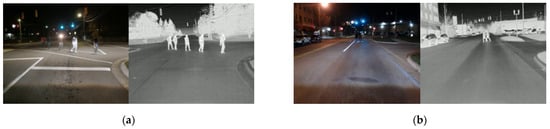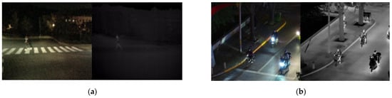 To develop the nighttime pedestrian detection system, two publicly available datasets were used: the KAIST dataset [] and the LLVIP (Low Light Vision Pedestrian) dataset []. The KAIST dataset [], published in 2015, initiated low-light object detection research. This dataset consists of pairs of aligned RGB and thermal images, all with a resolution of 640 × 512 for pedestrian detection. The second dataset is the LLVIP (Low Light Vision Pedestrian) dataset [], which comprises pairs of RGB and thermal images taken in low-visibility scenes, with all images in the dataset spatially aligned. Example images from these datasets are shown in Figure 6a,b for the KAIST dataset and the LLVIP dataset, respectively. However, these two datasets have several drawbacks. The KAIST dataset suffers from extremely poor IR image quality, as shown in Figure 6a, while the LLVIP dataset consists of images captured by surveillance cameras, which do not align with the viewpoint of the cameras mounted on vehicles.