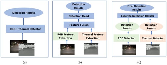 Lastly, the late-fusion method involves making decisions after independent detections on RGB and thermal images. A final detection is determined by combining the confidence scores of the individual detections [,,,]. In [], the authors implemented the Retina Net algorithm independently on the RGB and IR images. Then, they applied non-maximum suppression to combine the individual sensor outputs. Sousa et al. [] used YOLOv5 for object detection, where objects in RGB and thermal images are detected separately. Then, they employed a fully connected multi-layer neural network to combine the outputs from each sensor. In [], the authors used YOLOv3-tiny for object detection on individual sensors. In addition, they also used connected components in thermal images to leverage detection accuracy. Late fusion was implemented into a single confidence map. Yang et al. in [] used YOLOv4 for individual sensor object detection. They proposed an Illumination-Aware Network (IAN) to decide which model to trust based on paired RGB/IR images, generating object detection results and confidence weights.