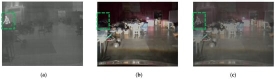 Figure 9 shows an example of information fusion using the weighted sum method with the weights WIR = 0.6 and WRGB = 0.4. Figure 9a,b are taken from the IR camera and the RGB camera, respectively. As shown in Figure 9b, the RGB camera image did not capture the details of the person (marked with a green dotted rectangle) under low-light conditions. On the other hand, the IR image in Figure 9a shows the details of the person in the same scene. The fused image using the weighted sum method displays the person in the same scene as presented in Figure 9c. The early-fusion model is trained with 110,000 training samples in Table 3. Rather than training from scratch, the model is developed using the transfer learning method [] with the pre-trained YOLO v5 [] model, as shown in Figure 10.