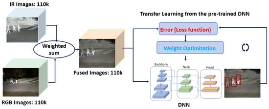 Early Fusion: As depicted in Figure 8a, the early-fusion method integrates input images from multiple sensors at the beginning of a data processing pipeline, before the DNN model. The objective is to create a unified and comprehensive representation of the scene by leveraging the complementary nature of RGB and thermal information. The IR and RGB images are fused using the weighted sum method [], which employs a mathematical approach to combine multiple values. Each value is multiplied by a specific weight, reflecting its significance in the overall decision-making process. The following procedures are applied to fuse the images from two sensors: