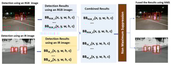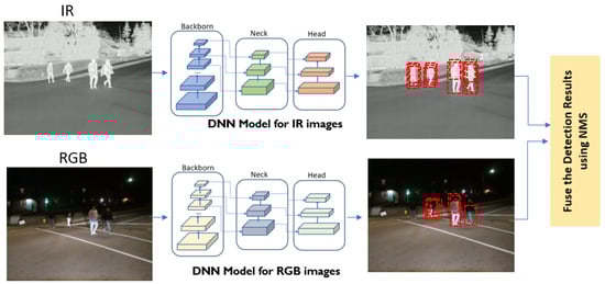 Late Fusion: Late fusion is a technique that involves merging detection results after independent detections on RGB and IR thermal images. This approach allows for the utilization of diverse types of data or DNN models, potentially leading to improved performance or robustness compared to using any single modality or model in isolation. Late fusion contrasts with early fusion, where data from different sources are combined before being fed into DNN models. In Figure 11, an overview of the late-fusion method is presented, illustrating how RGB and IR images are separately input into the object detection DNN models. Each detection includes details such as bounding box information and confidence scores for each detected object. The outcomes from each sensor are compared and merged, as shown in Figure 11, using the Non-Maximum Suppression (NMS) algorithm [].