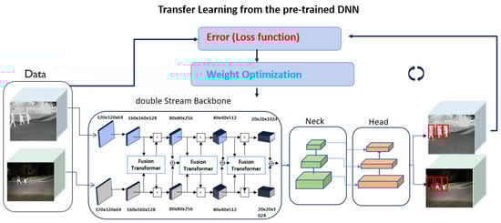 Mid Fusion: To implement the mid-fusion method using RGB and IR images, the original YOLO v5 algorithm was redesigned with dual-stream backbones, as described in [] and illustrated in Figure 13. This approach processes RGB and IR thermal images separately: the first stream backbone extracts features from RGB images, while the second backbone extracts features from thermal images. The key component of this architecture is the CFT modules [], where features from RGB and IR thermal images are integrated. The proposed mid-fusion model is trained using transfer learning with 110,000 data samples, as shown in Table 3. Integrating RGB image features with thermal image features enhances feature richness. These enriched features are then reprocessed through the RGB backbone and, similarly, thermal images are enhanced with RGB features and reprocessed through the thermal backbone. This fusion of features improves detection across multiple scales.