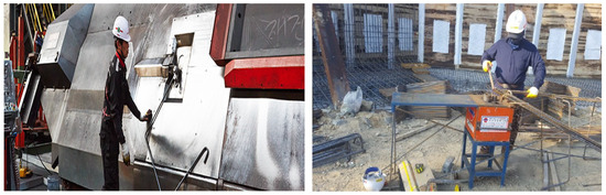 To address these issues, several studies have introduced automated smart production systems aimed at reducing processing defects and enhancing productivity through automated correction via real-time image processing. For instance, in the rebar processing workflow, it is crucial to detect rebar twisting in real-time, from the start of production until just before cutting. In the authors’ prior research [5], a machine vision camera was installed at the location where the rebar is extruded, as shown in Figure 2a, to assess the twisting of the rebar from after its extrusion until just before it is shaped. To analyze the captured images, a combination of algorithms was employed, including Oriented FAST and Rotated BRIEF (ORB), Region of Interest (ROI), and Hough Transform. These algorithms were utilized to differentiate the rebar from the background and to conduct feature matching, which determines the extent of the rebar’s twisting.