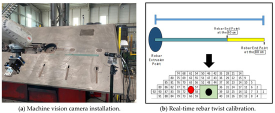 (a) shows the installation of a machine vision camera; (b) illustrates real-time calibration of rebar twist using grid cells. Detecting the rebar endpoint at the 60 cm mark from the extrusion point is crucial for predicting its future location at the 80 cm mark. Within the grid cell, black dots and green rectangular boundary boxes signify normal positions of rebar. Any deviation of rebar from this boundary box is marked by a red dot within grid cells. This deviation is indicative of twisting.