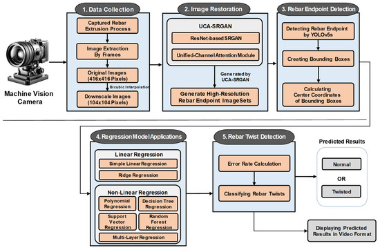 During the data collection phase, the rebar extrusion process is captured on video using a machine vision camera. The video is then decomposed into frames, and each frame is converted into an image. The extracted images are divided into two groups for image restoration: 1500 original rebar images and 1500 downscaled rebar images. In the image restoration phase, we apply the UCA module to the SRGAN based on ResNet to enhance the performance of rebar endpoint detection. This leads to the generation of high-resolution rebar endpoint image sets. The UCA-SRGAN model plays a crucial role in improving the quality of low-resolution grayscale images, which directly impacts the accuracy of subsequent phases. The third phase, rebar endpoint detection, involves selecting 500 high-resolution images from the generated rebar endpoint image sets to train the YOLOv5s model. The trained YOLOv5s model then detects rebar endpoints in real time by creating bounding boxes. Additionally, during this phase, the central coordinates of the bounding boxes are obtained in real time. The performance of this phase is significantly influenced by the quality of the restored images from the previous phase. During the regression model application phase, these central coordinates are used to train various linear and non-linear regression models, which then predict the future positions of the rebar endpoints every 60 frames. The accurate coordinates obtained from high-resolution images play a crucial role in enhancing the prediction performance of the regression model, thereby reducing the error rate in rebar twist detection. In the final phase, rebar twist detection, we calculate the error rate based on the distance between the actual and predicted rebar endpoint positions. We define a Rebar Twist as occurring when this error rate exceeds 5%. Specifically, if the normalized Euclidean distance between the predicted and actual rebar endpoint positions is greater than 5%, it is classified as a ‘twist’. Conversely, a result that falls within this 5% threshold is considered ‘normal’. The accuracy of this classification heavily depends on the precision of both the endpoint detection and the regression model predictions.