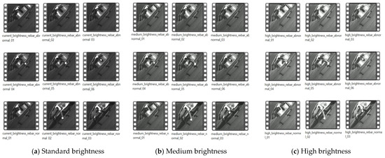 27 videos of the rebar extrusion process under different lighting conditions: (a) standard brightness (brightness level ~64,200 W LED, 10 ms exposure); (b) medium brightness (brightness level ~96,200 W LED, 15 ms exposure); (c) high brightness (brightness level ~128,200 W LED, 20 ms exposure). Each row within a lighting condition shows abnormal (top and middle) and normal (bottom) rebar extrusion processes.