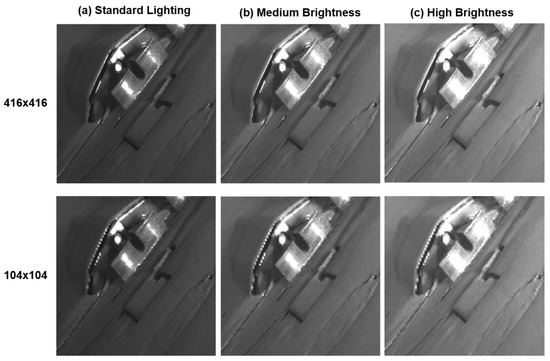 During the image restoration phase, our goal is to use downscaled low-resolution images as input to restore them to their original high-resolution state. To achieve this, we selectively extracted 1500 original rebar images of 416 × 416 pixels from each set of 9 videos under different lighting conditions, as shown in Figure 5 (top). We then applied the Bicubic Interpolation technique to downscale these images to 104 × 104 pixels, creating 1500 low-resolution rebar images for each lighting condition, as shown in Figure 5 (bottom). This Bicubic Interpolation method interpolates the values of adjacent pixels, reducing the resolution of the images while smoothly maintaining the details.
