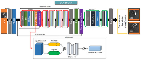 The UCA module operates on the feature maps extracted by the convolutional layers of the SRGAN. It performs channel-wise average and max pooling operations to capture the global and local importance of each feature channel. The AVG pooling identifies the overall intensity level of each channel, while the MAX pooling captures the most salient features. By considering both these aspects, the UCA module can effectively emphasize the important contrast and texture information in the input image. The pooled features are then concatenated and processed by two Fully Connected (FC) layers, which learn to assign channel-specific weights. These weights are applied to the original feature maps via element-wise multiplication, adaptively refining the feature representations. By employing ReLU and Sigmoid activation functions, the importance of each channel is adjusted and then applied to the original feature maps, resulting in the creation of the Channel Attention Map (Mc).