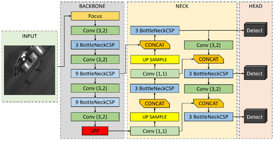 The Backbone, serving as the core component, extracts feature maps of various sizes from the input image. This extraction is achieved by dividing the image into four segments and combining them at the channel level, effectively reducing the resolution while increasing the density of critical information. It consists of several convolution and pooling layers, employing BottleNeckCSP and Spatial Pyramid Pooling (SPP) techniques. BottleNeckCSP enhances computational efficiency and gradient flow, thereby improving performance, while SPP boosts the spatial information of feature maps by pooling with various filter sizes. The Focus Layer, within the Backbone, serves as the basic feature extraction block, incorporating batch normalization and a leaky ReLU activation function. Following this, a Convolutional Layer (e.g., Conv(3,2)) with a 3 × 3 kernel reduces dimensions, and the initial three BottleNeckCSP layers enhance the model’s learning capabilities. After the second Conv(3,2), nine BottleNeckCSP layers are arranged sequentially to further enhance complex pattern recognition. The SPP layer then extracts features of varying sizes, enabling the model to recognize objects across different scales.
