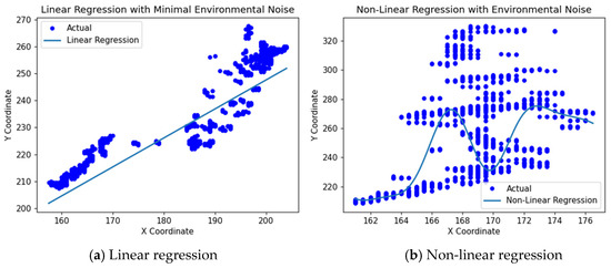 Figure 9 illustrates the application of linear and non-linear regression models for predicting the rebar endpoint location. Figure 9a depicts a linear regression model applied in scenarios with minimal environmental noise, visualizing both the actual and predicted locations of the rebar endpoint along the X- and Y-axes. Conversely, Figure 9b shows how a non-linear regression model effectively captures complex patterns and dynamic changes in data influenced by environmental noise. Although normal rebar extrusion typically exhibits a linear pattern, the endpoint of the rebar may exhibit slight shaking phenomena, adding non-linear characteristics. In contrast, abnormal extrusions reveal more non-linear patterns, increasing the uncertainty in prediction performance.