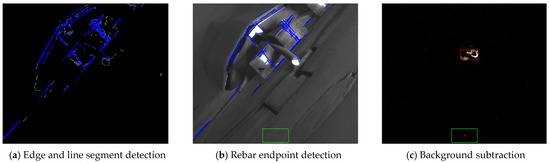 Results of traditional image processing techniques: (a) edge detection and line segment detection results based on Canny edge, (b) rebar endpoint detection results using Hough transform, (c) results of background subtraction and real-time tracking of center coordinates of moving area.