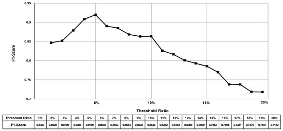 The values of the error rate threshold used for classifying rebar twists can significantly affect the performance of our proposed technique. In this experiment, we thoroughly analyzed the impact of threshold values on the detection performance using the F1 score. To determine the optimal threshold value, we varied the threshold from 1% to 20% in increments of 1% and evaluated the corresponding F1 score at each step. Figure 12 illustrates the impact of different threshold values on the performance of our rebar twist detection technique.
