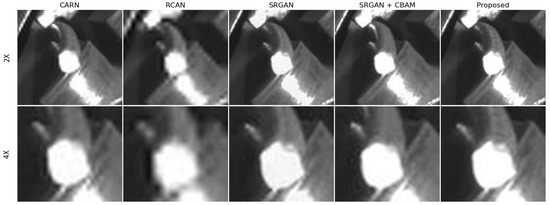 To further illustrate the qualitative differences between the models, Figure 13 presents visual comparisons of the restored images for rebar endpoints generated by five representative models: ESPCN, RCAN, SRGAN, CBAM-SRGAN, and the proposed UCA-SRGAN. For each model, images magnified by 2× and 4× are provided. The UCA-SRGAN model produces visually sharper and more detailed images compared to other models, with better preservation of rebar textures and edges. In the case of SRGAN and CBAM-SRGAN, blurry rebar patterns are observed when visually magnified. Interestingly, despite good quality metrics, images from the ESPCN and RCAN models sometimes appear to have lower perceptual quality to the human eye, with less defined edges and slightly fuzzy textures.