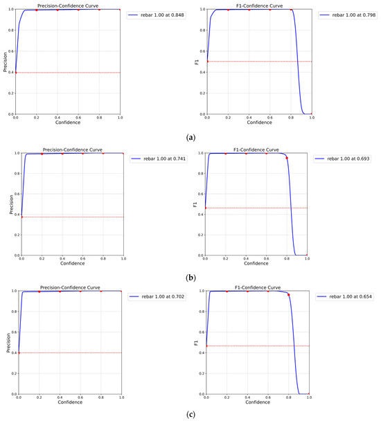 The YOLOv5s models’ performance on each dataset was evaluated using precision-confidence and F1-confidence curves. These curves plot the precision and F1-score, respectively, against the confidence threshold used for detecting objects. By varying the confidence threshold, we can evaluate the model’s performance at different levels of detection certainty. In real-world manufacturing settings, these curves can be utilized in real-time video processing to enable accurate object detection under various environmental conditions, such as changes in lighting, machine movement, and orientation. Additionally, these curves can be used to find the optimal balance between precision and recall, minimizing false positives (i.e., incorrectly detecting non-rebar objects as rebar endpoints) and false negatives (i.e., failing to detect actual rebar endpoints) based on the specific requirements of the application. Table 6 presents the detection results for each dataset under standard, medium, and high brightness settings.