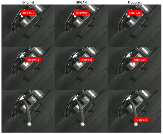 In the experiments, under medium brightness conditions, the ESPCN, RCAN, SRCNN, and DBPN models maintained relatively high scores in PSNR and SSIM but still performed somewhat lower than the UCA-SRGAN model. Overall performance decreased under medium brightness conditions, but the proposed UCA-SRGAN model still showed the highest performance. However, under high brightness conditions, the performance of all models significantly dropped. This can be attributed to the similarity in color between the rebar endpoints and background noise, leading to many false detections, as well as additional noise caused by flickering phenomena. This suggests that model performance can vary greatly depending on lighting conditions. Additionally, it was difficult to use these images for training YOLOv5, and additional noise occurred due to flickering during the process of collecting endpoint data under high brightness.