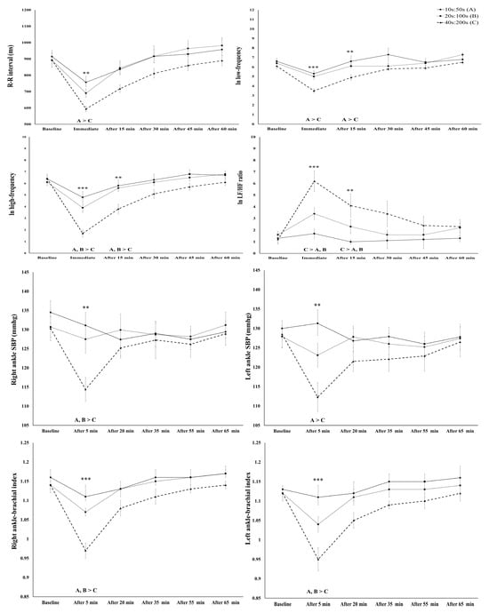 Our repeated-measures ANOVA exhibited a significant interaction effect between groups by time in heart rate (HR) and R-R interval (F = 2.24, p < 0.05, : 0.11). Although RMSSD, SDNN, and pNN50 showed a significant main effect of time on the acute response to HIIT (p < 0.001), there was no significant interaction effect between groups over time (Table 2). HRs measured at time points immediately after and 15 min after HIIT were higher in the 40 s/200 s protocol than the 10 s/50 s and 20 s/100 s protocols (p < 0.01), and in the 40 s/200 s protocol, they were higher than the 10 s/50 s protocol at 30 min after HIIT (p < 0.05). The R-R interval measured immediately after HIIT was higher in the 10 s/50 s protocol than the 40 s/200 s protocol (p < 0.01). There was a significant interaction effect for groups by time in ln LF (F = 2.34, p < 0.05, : 0.12), ln HF (F = 5.60, p < 0.01, : 0.24), and ln LH/HF ratios (F = 4.13, p < 0.01, : 0.20) (Figure 1). Especially, the ln LF of the 10 s/50 s protocol was higher than that of the 40 s/200 s protocol at the time points immediately after (p < 0.001) and 15 min after HIIT (p < 0.01). The ln HF in the 10 s/50 s and 20 s/100 s protocols was higher immediately after (p < 0.001) and 15 min after HIIT (p < 0.01) than in the 40 s/200 s protocol. In addition, the ln LF/HF ratio of the 40 s/200 s protocol was higher than that of the 10 s/50 s and 20 s/100 s protocols at the time points immediately after (p < 0.001) and 15 min after HIIT (p < 0.01). In the bilateral brachial SBP, no significant interaction effect was observed between the groups by time. However, there was a significant interaction effect between the groups by time for bilateral ankle SBP (right, F = 2.99, p < 0.01, : 0.14; left; F = 4.18, p < 0.001, : 0.19). However, right and left ankle SBP in the 10 s/50 s and 20 s/100 s protocols was higher 5 min after HIIT compared with the 40 s/200 s protocol (p < 0.01) (Figure 1). For bilateral ba-PWV, despite a significant main effect of time, there was no significant interaction effect for the groups by time. The bilateral ABI showed a significant interaction effect between the groups by time (right, F = 3.02, p < 0.01, : 0.14; left, F = 4.73, p < 0.001, : 0.21). For 5 min after HIIT, the right ABI was higher in the 10 s/50 s protocol than in the 40 s/200 s protocol, and the left ABI was higher in the 10 s/50 s and 20 s/100 s protocols than in the 40 s/200 s protocol (all p < 0.001). See Table 3.