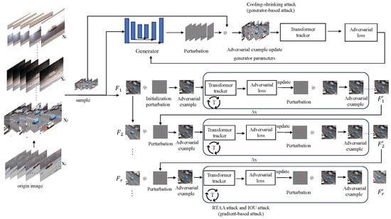 The entire process flow is illustrated in Figure 2. Three attack methods were implemented: cooling–shrinking attack [8], IoU attack [9], and RTAA attack [13]. The cooling-shrinking attack is a generator-based adversarial attack, while the IoU attack and RTAA attack are gradient-based adversarial attacks. These attack methods are applied to the TransT [20] and MixFormer [21] models, respectively, to evaluate the adversarial robustness of their transformer trackers.