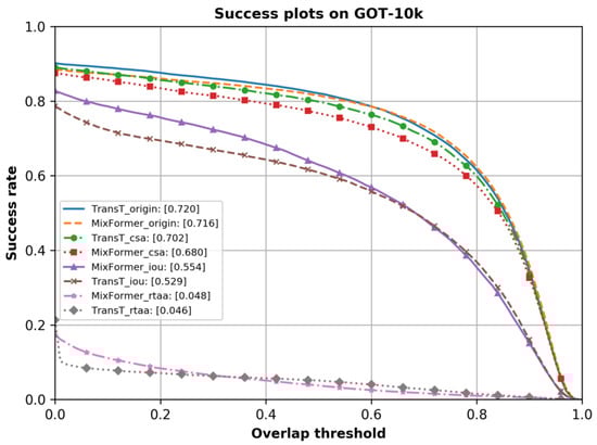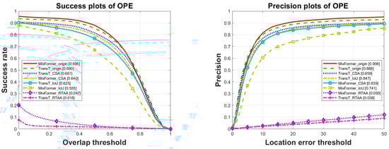 As shown in Table 4 and Table 5, and Figure 5, three types of adversarial attacks on both trackers were conducted on the GOT-10k [19] dataset. By observing the metrics of average overlap (AO), success rate at overlap (), and success rate at overlap (), it was evident that the overall performance of these trackers decreased. Specifically, the MixFormer and TransT trackers experienced declines in the average overlap (AO) of and , and , and and under the RTAA attack, the IoU attack, and the CSA attack, respectively.