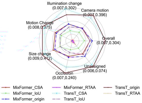 Upon observing the target radar chart on the VOT2018 [18] dataset, a decline in tracking performance was clear when facing the three types of adversarial attacks, including scenarios involving occlusion, unassigned, and overall. Among them, the RTAA attack had the strongest effect, as it exhibited nearly the worst performance in all scenarios, where the preselected box did not cover the tracking target. The IoU attack came next, showing a comprehensive performance decrease across all scenarios. As for the CSA attack, it exhibited enhancement in certain scenarios because the CSA attack mainly targeted the SiamRPN++ model and exhibited significant attack effectiveness on this model. This means that the transferability of the CSA attack was not good for the TransT and MixFormer models.