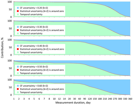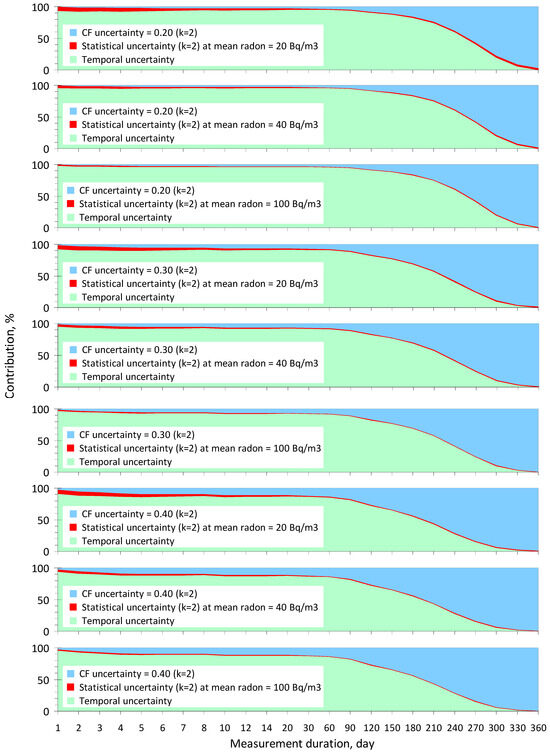 Furthermore, and this is the main conclusion, we can clearly see that the temporal component is the most important source of annual average concentration uncertainty for measurement durations of up to 6 months. This is the main motivation as to why the study of temporal uncertainty is the most urgent task in modern radon metrology, without solving which it is impossible to improve QA/QC in indoor radon measurements.