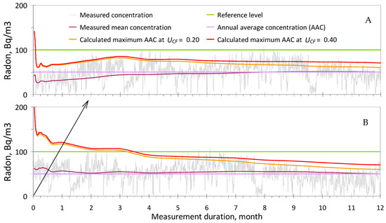 To demonstrate the online operation of the rational Criterion (1), Figure 3 presents a year-long time series of radon concentrations measured by RadonEye Plus2, transformed to make the annual average concentration (AAC) equal to 50 Bq/m3 for ease of analysis. In addition, the dynamics of the measured mean concentration and of the calculated maximum AAC are shown, considering the increasing duration of continuous measurements. The maximum AAC is the calculated value of the upper bound of the confidence interval for the AAC (with 95% probability), which is online compared to the RL, according to (4). If the calculated maximum AAC does not exceed CRL = 100 Bq/m3 during 4–6-day measurements, as seen in Figure 3A, it can be concluded that the AAC in the tested room does not exceed CRL = 100 Bq/m3 with 95% probability, and the test can be completed. It should be noted that the data in Figure 3 are independent of the monitor’s sensitivity, and there is no visible difference between the calculated maximum AAC at UCF = 0.20 (at k = 2) and 0.40 (at k = 2), if the measurement duration is not more than 2–3 months, as discussed in detail above. At the same time, for long-term indoor testing, there is no need to use monitors with UCF < 0.20 (at k = 2) due to the existence of year-to-year variations in indoor radon [32], which can serve as a benchmark for the maximum achievable accuracy within Criterion (1).