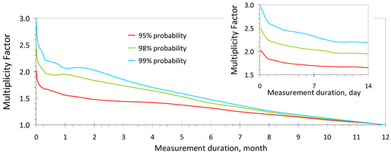 where MF(t) is the multiplicity factor defined as the value of 95-th percentile (or 95% probability) in the distribution of all ratios between the measured concentrations Cij(t) and the measured AAC: DEVij(t) = Cij(t)/CjAAC (i = 1…M; j = 1…N), in a representative sample of N buildings (rooms) within an international or national case study. It is important to clarify that the arrays of values Cij(t) and CjAAC are the same [20,30] that were used to determine the temporal uncertainty of indoor radon UV(t) (see Section 2.2). The MF(t) values are provided in Figure 4.