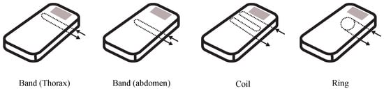 Very interesting results were presented in a study [69] where the author’s team built the measuring optical fiber of the interferometric sensor directly into a mattress. The benefit was a comparison of four different configurations of measuring fibers (band (thorax), band (abdomen), coil, ring). The basic monitored parameters were respiratory and heart rate (see: Figure 2).